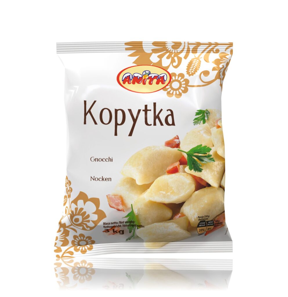 Kopytka Anita to mrożone kluski ziemniaczane w formie tradycyjnych „kopytek”, pakowane w duże porcje 3 kg. Ich skład oparty jest na ziemniakach, mące pszennej oraz skrobi ziemniaczanej, co zapewnia delikatną, sprężystą konsystencję i pełny, lekko ziemniaczany smak po przygotowaniu.