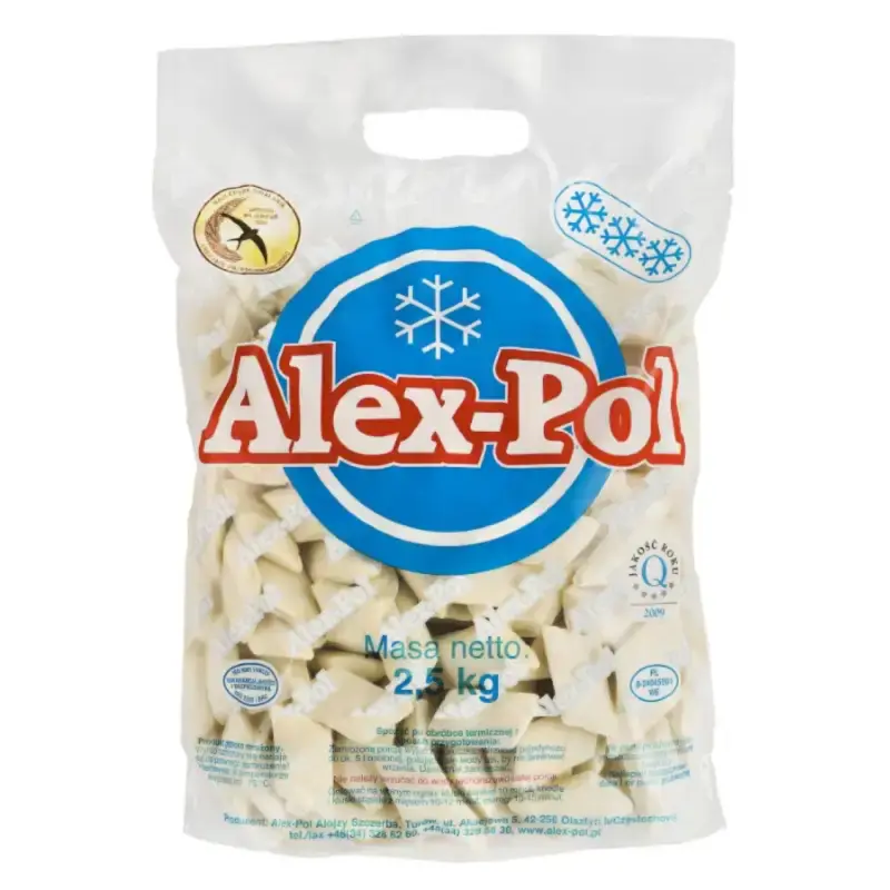 Produkt oferowany jest w praktycznym formacie: 2 opakowania po 2,5 kg, co daje w sumie 5 kg mrożonych kopytek gotowych do podania. Składniki typowych kopytek obejmują: gotowane ziemniaki (61 %), mąkę pszenną, płatki ziemniaczane, skrobię ziemniaczaną, wodę i sól, z dodatkiem modyfikowanej skrobi jako zagęstnika. W 100 g produktu znajdziesz około 160 kcal, z niską zawartością tłuszczu i cukrów.