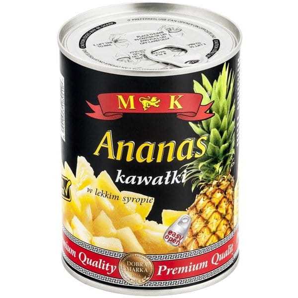 Ananas w kostce marki MK to wysokiej jakości produkt owocowy, przygotowany z dojrzałych, starannie wyselekcjonowanych ananasów. Owoce są krojone w równe kostki i zanurzone w lekkim syropie, co pozwala zachować ich naturalną soczystość, słodycz oraz intensywny, tropikalny aromat.