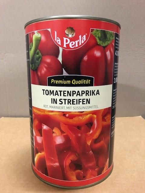 Papryka czerwona paski La Perla to wysokiej jakości marynowana papryka czerwona cięta w paski, oferowana przez markę La Perla – cenionego producenta przetworów warzywnych i owocowych. Produkt znajduje się w dużym opakowaniu o pojemności 4250 ml z masą całkowitą ok. 4100 g, a po odsączeniu uzyskuje się około 2000 g aromatycznych pasków papryki gotowych do użycia.
