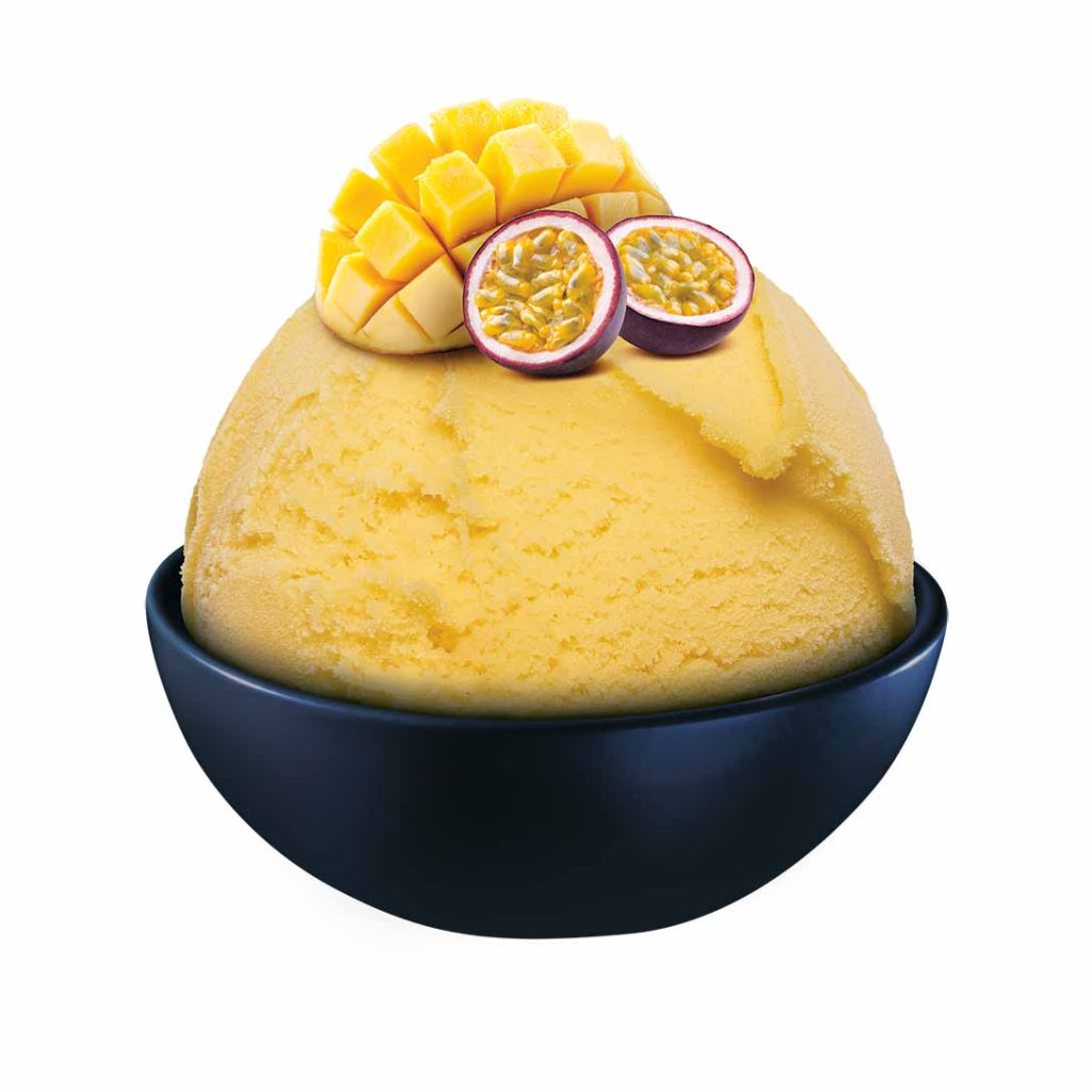 Produkt wyróżnia się gładką, jednolitą konsystencją oraz intensywnym, apetycznym kolorem, który efektownie prezentuje się po porcjowaniu. Sorbet mango–marakuja doskonale sprawdza się jako samodzielny deser, element pucharów lodowych, dodatek do deserów owocowych lub jako orzeźwiająca propozycja serwowana między daniami. Lekka forma sorbetu stanowi atrakcyjną alternatywę dla klasycznych lodów mlecznych.