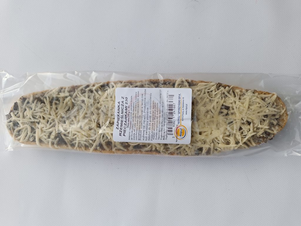 Rzemieślniczy charakter zapiekanki podkreśla struktura pieczywa – chrupiąca skórka i miękkie wnętrze zachowują doskonałą jakość po podgrzaniu. Farsz pieczarkowy zapewnia klasyczny, lubiany smak, który sprawdza się jako sycący, ciepły posiłek lub szybka propozycja do serwowania na gorąco.