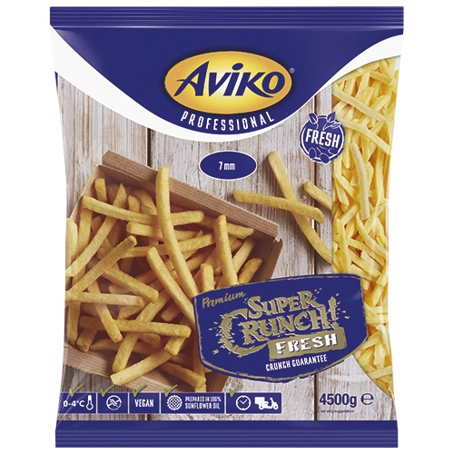 Premium Super Crunch 7 mm od Aviko to chłodzone frytki o wyjątkowej chrupkości, stworzone z myślą o najwyższej jakości serwowania. Dzięki specjalnej otoczce z mąki ryżowej zachowują doskonałą strukturę i temperaturę na dłużej – nawet po przygotowaniu. To sprawia, że są świetnym wyborem nie tylko do podania na miejscu, ale również do menu na wynos i z dostawą.