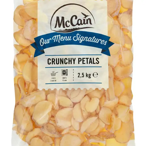Crunchy Petals to solone, falowane talarki ziemniaczane o cięciu S ze skórką, które wyróżniają się unikalnym, naturalnym wyglądem. Dzięki innowacyjnej, niewidocznej powłoczce SureCrisp, talarki zachowują wyjątkową chrupkość nawet podczas dostawy.