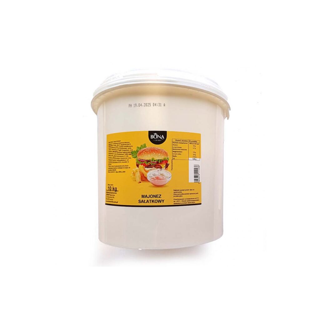 Majonez Sałatkowy marki BONA to gotowa baza o gładkiej, kremowej konsystencji i łagodnym smaku — perfekcyjna do sałatek, kanapek, burgerów i wszelkich przekąsek, gdzie liczy się szybkie i efektowne przygotowanie. Produkt dostępny w formacie wiadro 10 kg, co czyni go ekonomicznym rozwiązaniem przy dużych potrzebach.