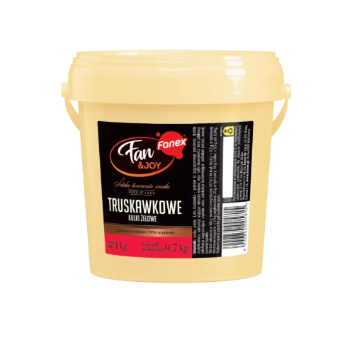 Fan&Joy truskawkowe kulki żelowe 1000g/700g Fanex to wyjątkowy dodatek smakowy o intensywnym aromacie świeżych truskawek, który wnosi do napojów i deserów nutę owocowej radości. Kulki skrywają soczyste, truskawkowe wnętrze w cienkiej żelowej otoczce, co daje efekt pękającej tekstury i słodkiego smaku przy każdym kęsie. Produkt jest gotowy do użycia od razu po odsączeniu, a jego pojemne opakowanie sprawia, że jest praktyczny i wygodny w zastosowaniu.
